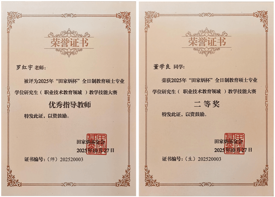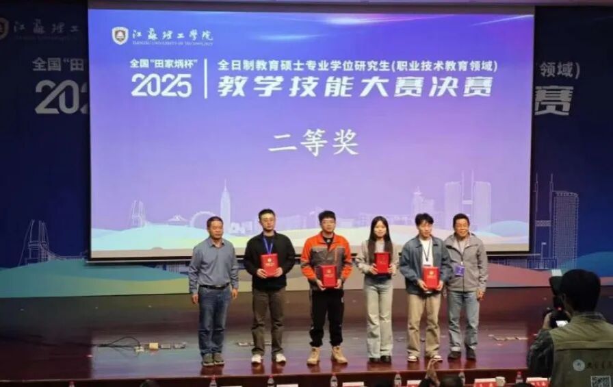 全国“田家炳杯”全日制教育硕士专业学位研究生(职业技术教育领域)教学技能大赛是职业技术教育领域极具权威性与影响力的赛事,旨在锤炼教育硕士教学实践能力、搭建全国性教学技能交流展示平台,是检验高校职业教育硕士培养水平的关键平台。研究生院于赛前三个月积极组织各研究生培养单位参加,电气与信息工程学院积极响应参加比赛并冲进决赛。本届赛事在江苏省常州市举办,初赛汇聚了全国35所高校的232位选手参赛,114人入围决赛。赛事涵盖教学设计、现场说课、现场答辩等多个环节,竞争异常激烈。董学良同学历经校内遴选、省级推荐、全国总决赛多轮严苛考验,凭借扎实的职业教育理论基础、创新的课堂教学设计与娴熟的教学实施能力,在众多参赛者中脱颖而出,成功拿下装备制造组“国家级二等奖”,指导教师罗红宇荣获“优秀指导教师”称号。