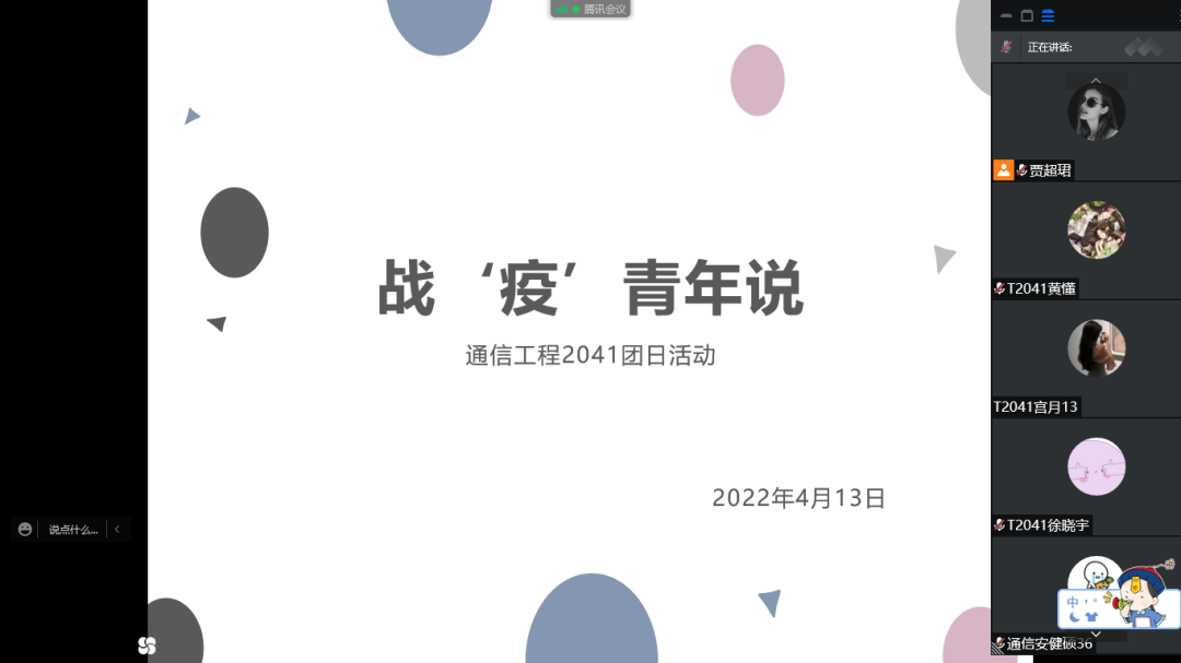 本次活动共有64个团支部通过腾讯会议等形式开展线上主题团日活动。在活动中,同学们都十分热情的分享身边各个岗位上参与防控工作的老师、后勤人员和学生志愿者等积极投身抗疫一线的感人事迹;志愿者分享参与疫情防控的切身感悟;团员分享校园封闭期间阳光乐学、积极向上的生活日常。